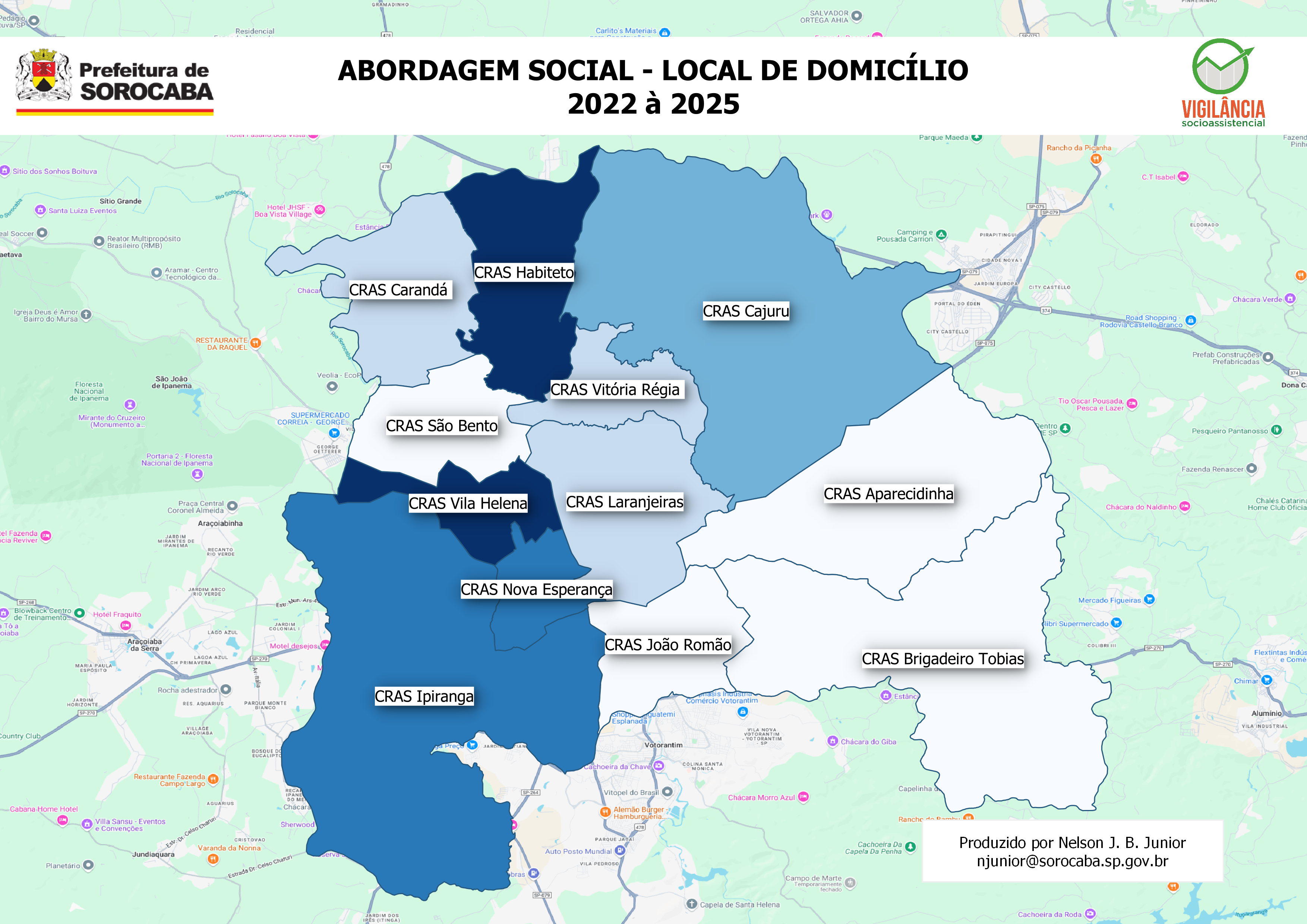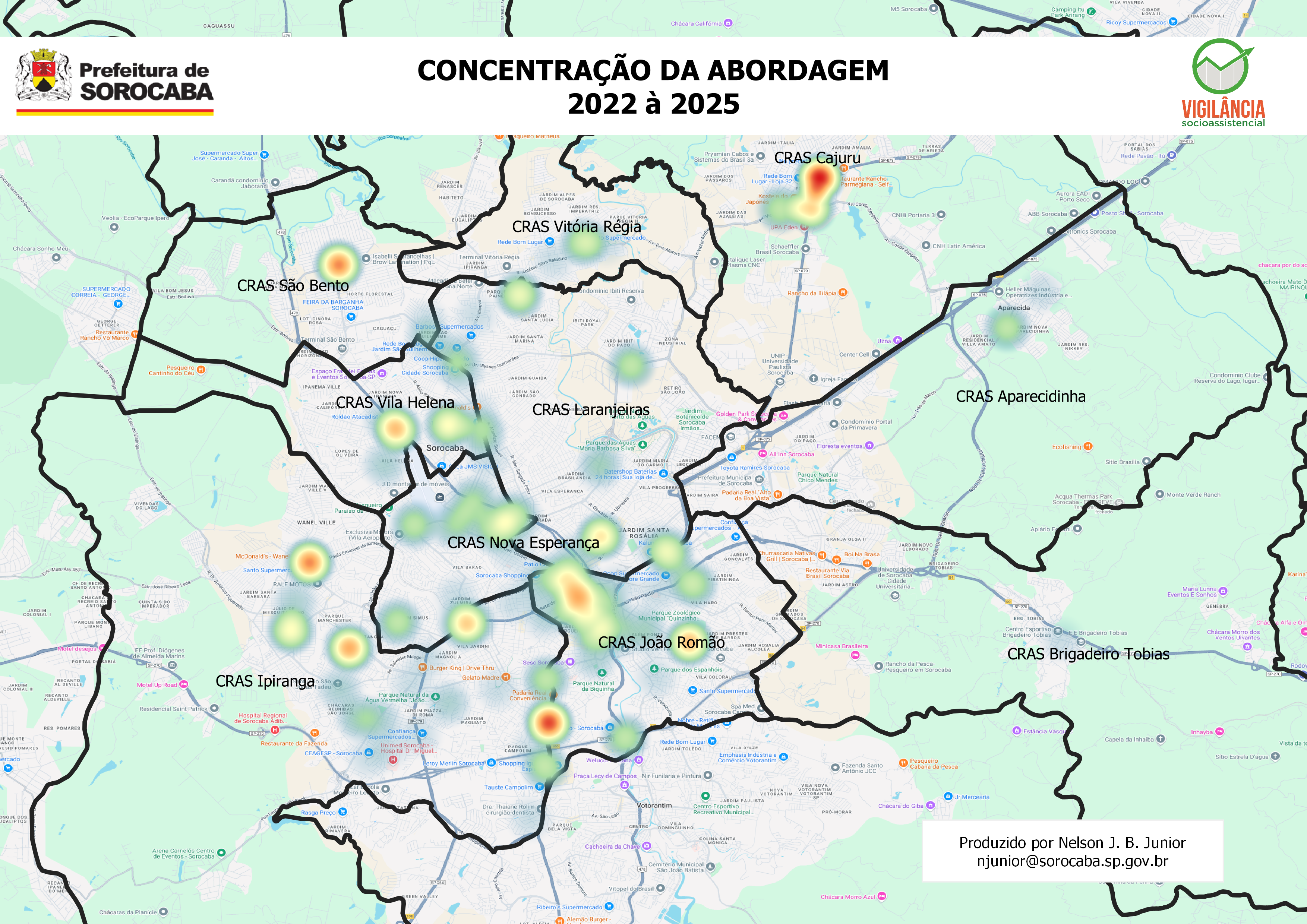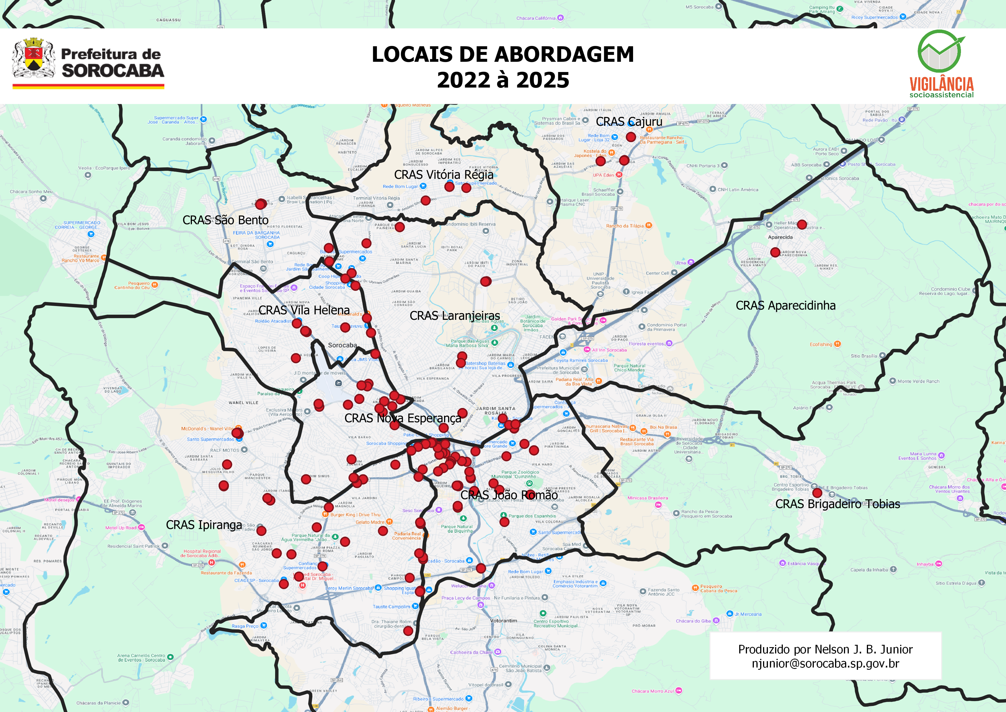 Mapeamento Trabalho Infantil Vigilância Socioassistencial no Combate ao Trabalho Infantil em Sorocaba A Vigilância Socioassistencial é fundamental para identificar e combater o trabalho infantil em Sorocaba. Por meio do monitoramento e análise de dados, o setor ajuda a mapear áreas de risco e direcionar ações específicas para proteger crianças e adolescentes. O setor conta com uma equipe técnica que inclui assistente social e profissionais de geoprocessamento. Essas ferramentas possibilitam a visualização das regiões com maior incidência de trabalho infantil, facilitando a articulação com serviços de assistência social e parceiros locais. As informações são disponibilizada para a rede de atendimento, além disto, o município conta com um software para registro de todas as ações feitas para o individuo e sua família, com possibilidade de registro dos atendimentos, encaminhamentos, acompanhamento, programas e benefícios, entre outros. MAPA GOOGLE MAPS de 2022 até 2025 Território de moradia e locais de abordagem das crianças/adolescentes em situação de Trabalho Infantil Concentração da Abordagem Bairros de Domicílio Locais de Abordagem PAINEL DE MONITORAMENTO – ABORDAGEM SOCIAL Abordagem Social de 2019 Abordagem Social de 2020 Abordagem Social de 2021 Abordagem Social de 2022 Abordagem Social de 2023 Abordagem Social de 2024 Abordagem Social de 2025 PAINEL DE MONITORAMENTO – FAMÍLIAS E INDIVIDUOS EM ACOMPANHAMENTO Acompanhamento CREAS 2025 MAPAS PARA IMPRESSÃO Local de Abordagem – Out 2018 à Maio 2019 Local de Abordagem – 2019 Local de Abordagem – 2020 Local de Abordagem – Jan à Jun 2020 Local de Abordagem – Jan à Out 2020 Local de Abordagem – 1º Semestre de 2021 v1 Local de Abordagem – 1º Semestre de 2021 v2 Local de Abordagem – 2021 v1 Local de Abordagem – 2021 v2 Local de Domicílio – Out 2018 à Maio 2019 Local de Domicílio – 2019 Local de Domicílio – 2020 Local de Domicílio – Jan à Jun 2020 Local de Domicílio – Jan à Out 2020 Local de Domicílio – Jan à Out 2020 com SCFV Local de Domicílio – 1º Semestre de 2021
